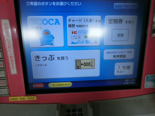 ピンク色の券売機で「きっぷを買う」ボタンを押します。
