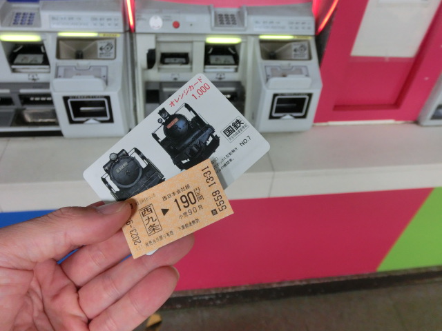 ・ピンク色の券売機できっぷを購入→オレンジカードで購入できました。