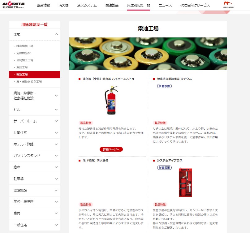 電池工場には消火設備として強化液(中性)消火器、泡消火器、等の消火システムをラインナップしています。